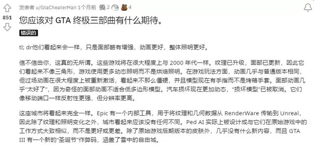 由于没有任何证据,Reddit管理员为这条帖子打上了“错误的”标签。而一个月后,事实证明,他的发言确实是错误的——因为GTA三部曲甚至比原版还要糟糕。