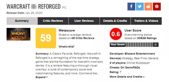 《魔兽争霸3:重制版》在Metacritic的用户评分仅为0.6分(10分制),曾一度刷新历史最低用户评分