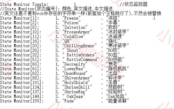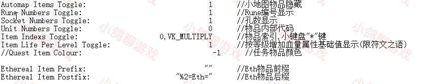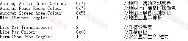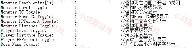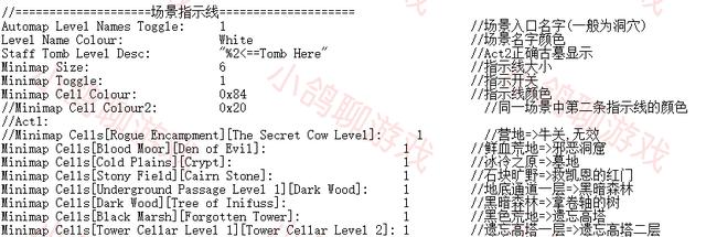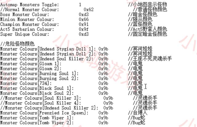 下面的是各种小地图上各种怪物的颜色,中间就是那些颜色代码。关于颜色代码一般都有自带的文件说明。还有一些特殊属性怪物的显示,比如地狱所有怪都有的特定某一系免疫。这些我们都可以不用管,不想在地图上显示怪物就直接把小地图显示怪物设为0就行。