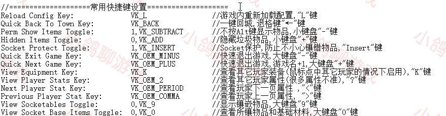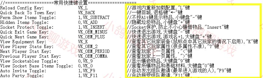 在配置文件中还有很多的东西可以设置,比如血保开关等等,这里就不细说了。最后说一点,配置文件里所有的功能,在代码前面加上双斜杠“//”,那么这个功能就被关闭了。比如关闭一键回城功能,在“Quick Back To Town Key”前面加上“//”,那么此功能就关闭了。
