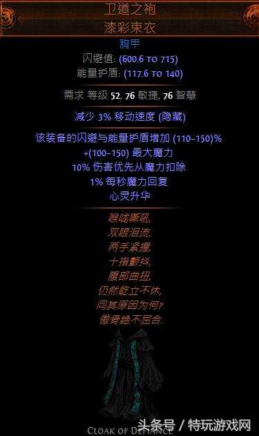 在换上烈焰风暴这个技能升级后,可以选择一路用高法术伤害和施法速度的长仗、法杖+盾牌即可,搬砖有了一定资金后,可以选择双持戒律之影这个法术匕首,同时还能点一下暗影刺客天赋范围内的匕首暴击圈,不网上用极品黄装的话,这个武器就是最好用的了: