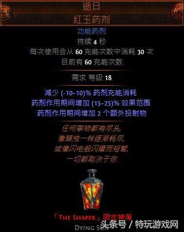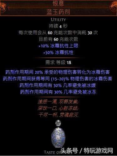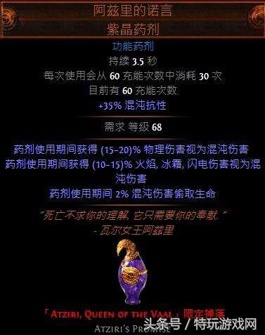 PS:药水中逝日和恨意都是为了提升输出所带,前期可以不用,后面有钱了在买,阿兹里的诺言速成女王水,1C1瓶,极大的增伤能力,必备,水银药剂与血药必备要用改造石洗出解流血与冰冻。