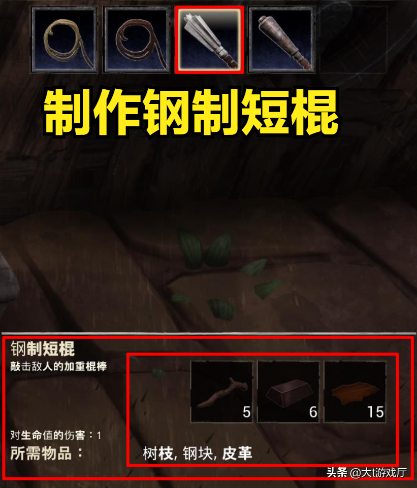 然后是钢制短棍,也是在拷打者工作台中制作,需要5个树枝,6个钢块和15张皮革。如果你手中材料不够的话,也可以制作选项中比较基础的。