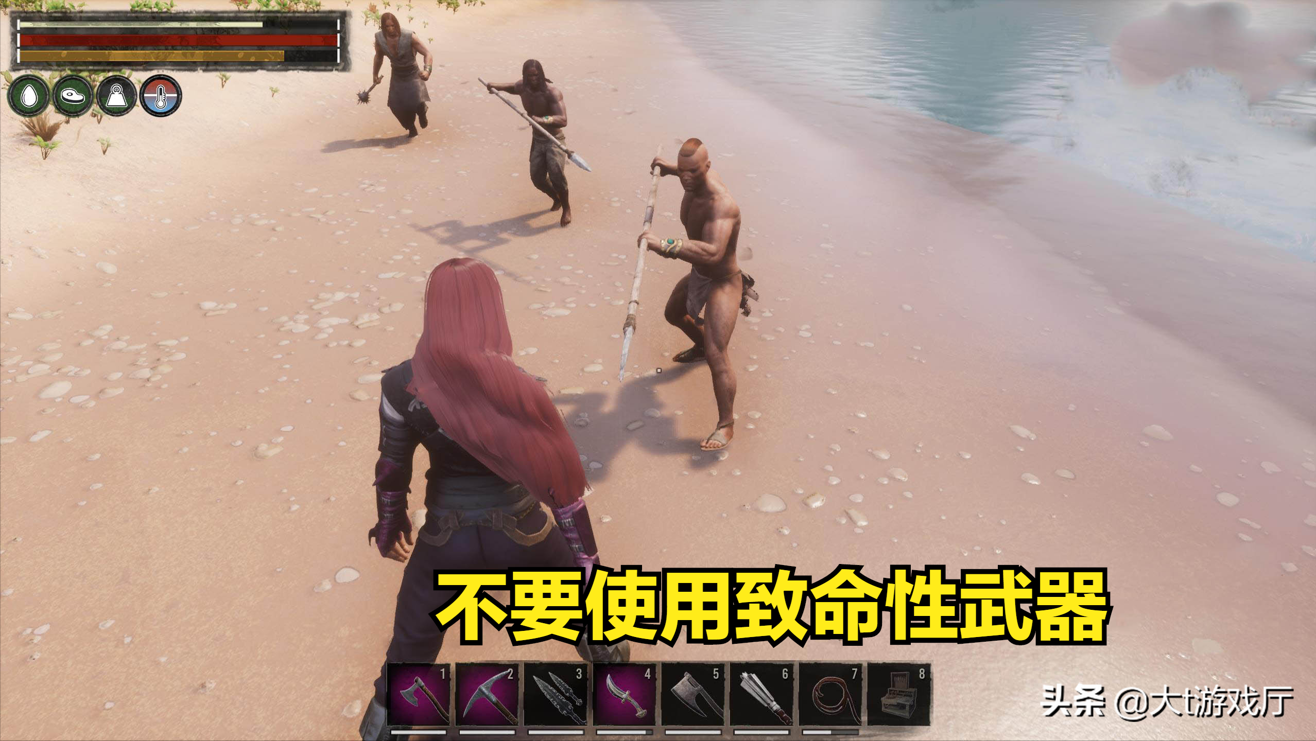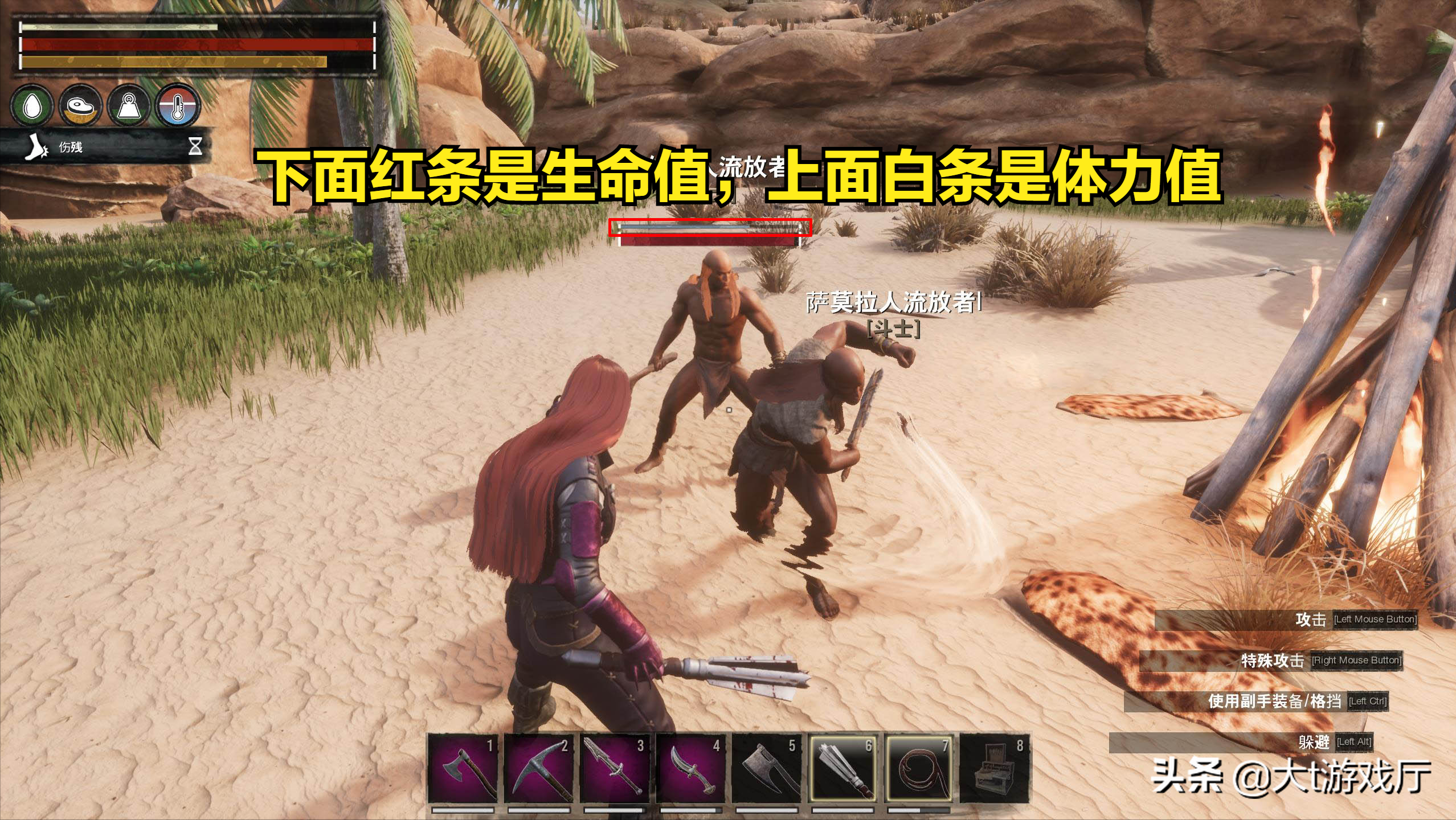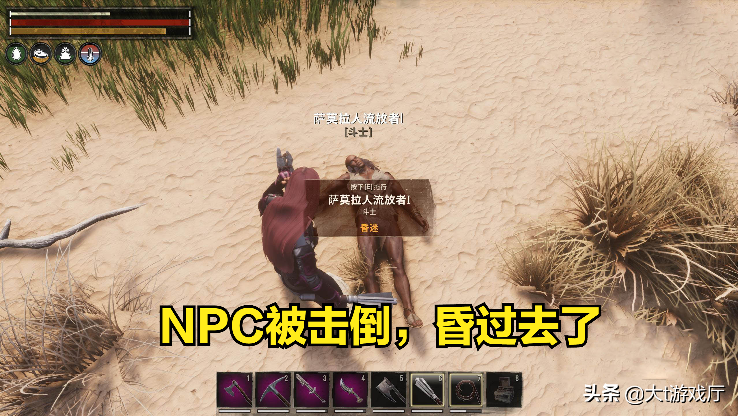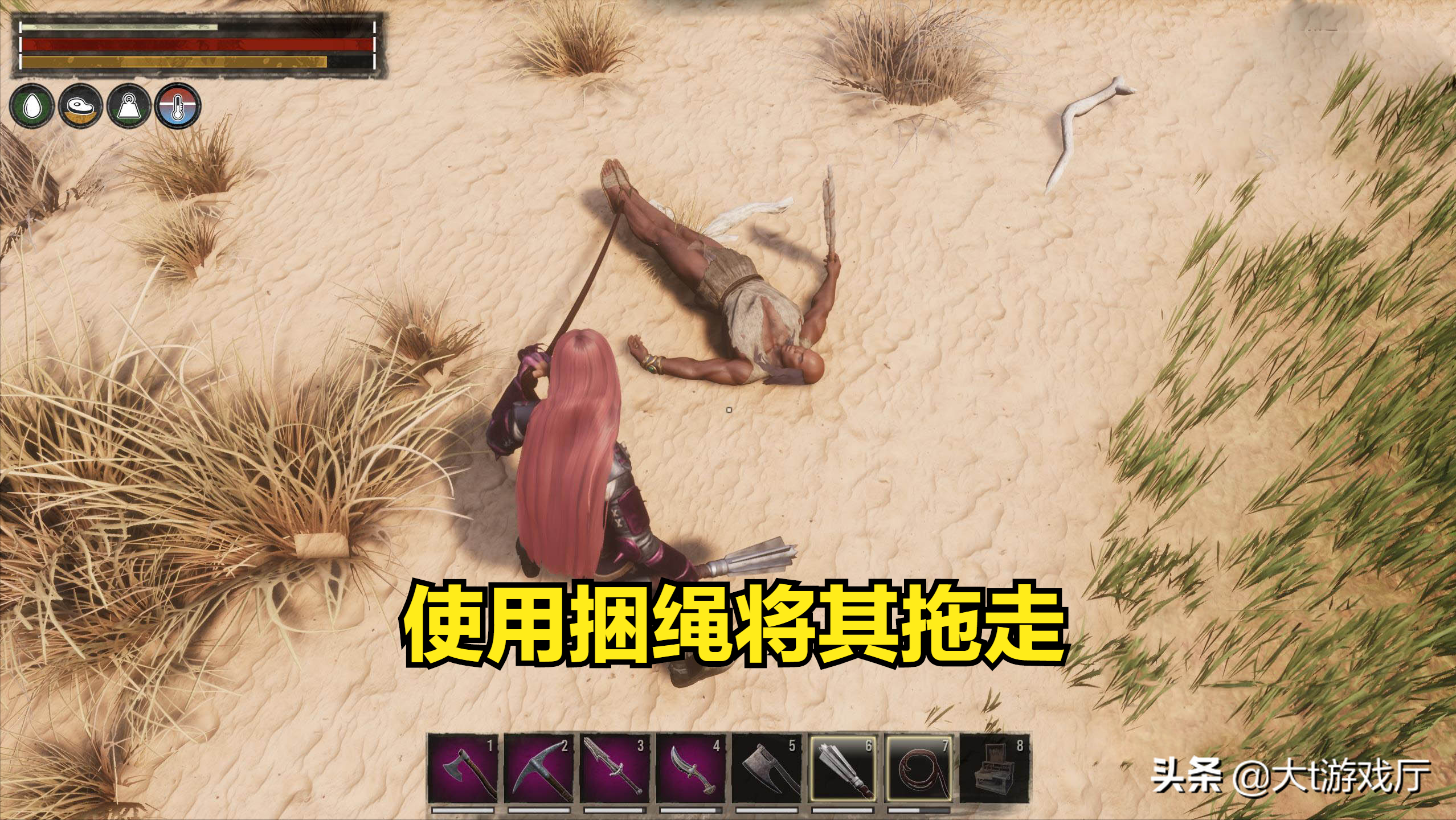 当NPC体力耗尽后,就会昏迷,这时可以使用手中的皮革捆绑绳,将昏倒的敌人拖走。
