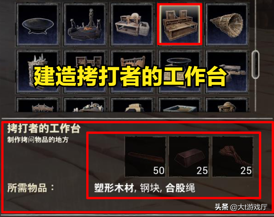 要先建造一个拷打者的工作台,材料需要50个塑形木材,25个钢块和25个合股绳,具体材料可通过合成,塑形木材可在木匠台制作,钢块可通过铁块加钢油合成,合股绳使用纤维草直接在背包中制作。
