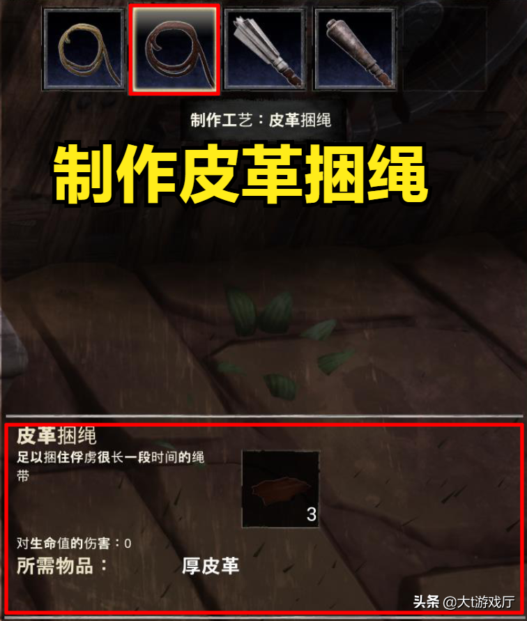 皮革捆绳仅需三张厚皮革就可在拷打者工作台中制作。