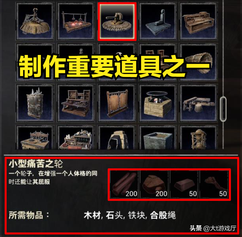 要建立一个驯化奴隶的工具,叫做“痛苦之轮”,但这种工具分为三种,有最基础的,普通的,和大型的,如果你是刚刚玩这个游戏,没有太多先进材料的话,就可建造一个比较基础的小型“痛苦之轮”,当中需要的材料,200块木材,200块石头,50块钢铁块,50个合股绳。木材和石头很好找,满地图都可以开采,铁则需要铁矿石和熔炉炼成,合股绳就不用说了,之前我提到过。