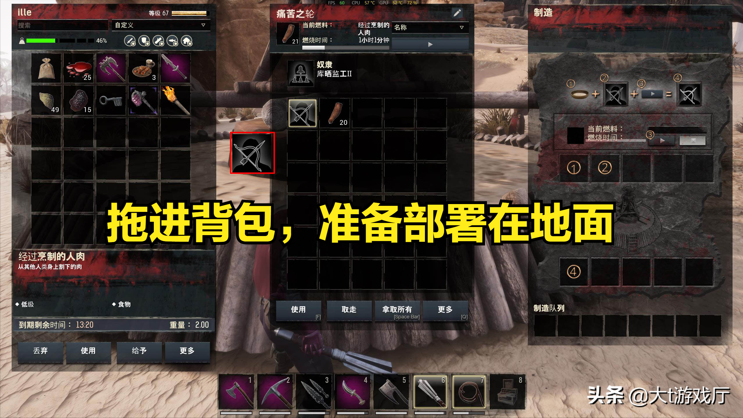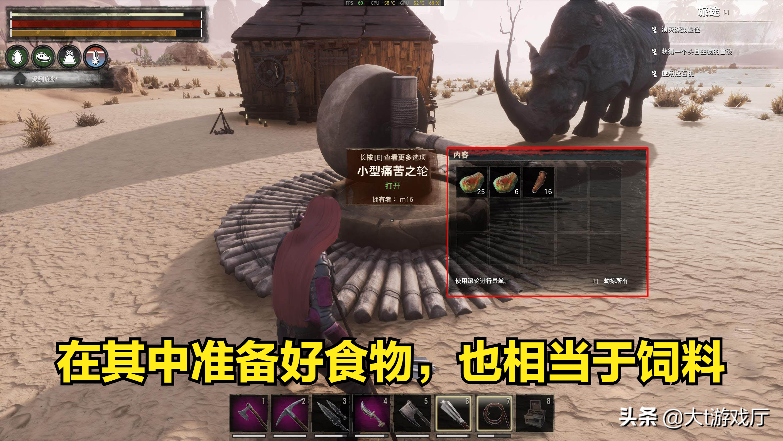 然后将昏倒的NPC拖进“痛苦之轮”里,在其中准备好相应的食物,比如烤熟的肉类等等,然后你就会看到,之前抓住的NPC在当中拉磨不停地转。