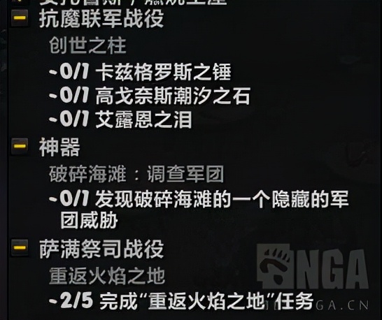 首先是抗魔联军战役的前两章,下图中抗魔联军和突袭破碎海滩这两个,正常小号做完解锁职业大厅和神器,应该都有了,任务栏里会有一个抗魔联军战役和神器的分类,分别有一个未完成的创世之柱的任务(因为一般只要做一两个地图就满级了)和一个发现破碎海滩威胁的任务。