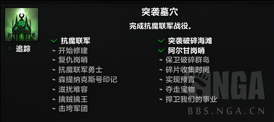 做完之后去破碎海滩找马维,会有一个叫抗魔联军勇士的任务(另一个完成一次突袭的任务不需要做),回职业大厅会有新的橙色感叹号,继续做完,直到显示抗魔联军战役故事进度或者突袭墓穴成就提示里的“抗魔联军勇士”这一行亮起来