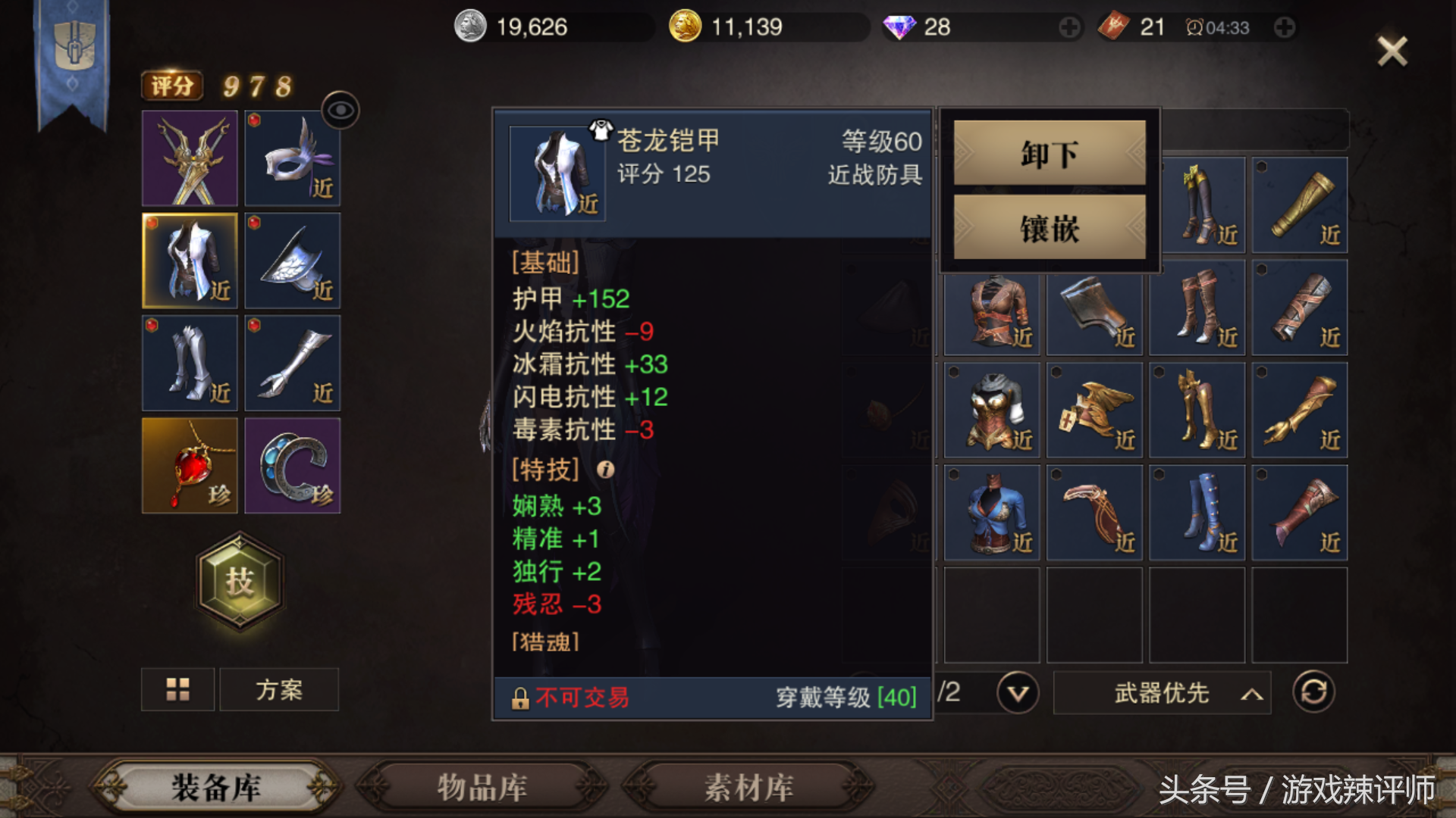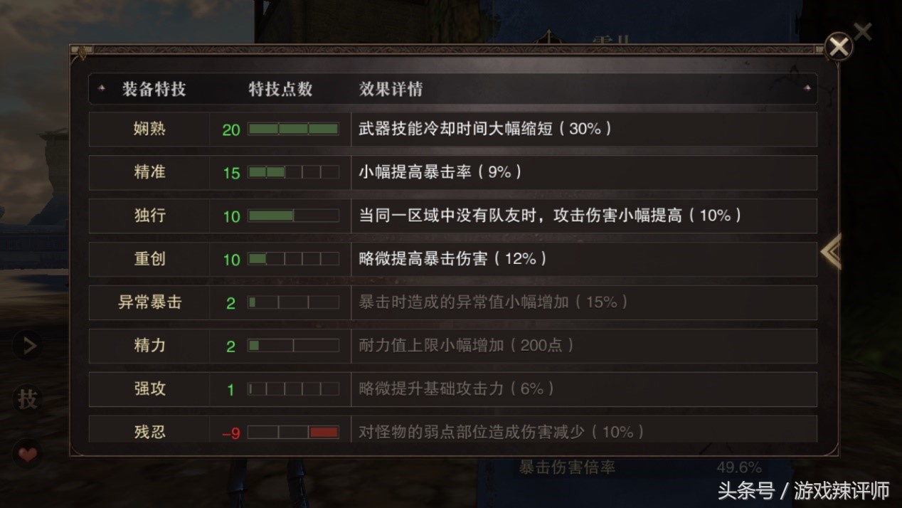 再说说防具吧,防具套装这方面其实没有唯一的搭配,自己用得顺手就行,只要是往攻击型特技的方向走就没错,那么什么是攻击型特技呢?打个比方,笔者选择暴击武器,那么防具的选择上就会偏向于此属性,因此苍龙套和凯骨套这种带有增加暴击率属性(“精准”可以增加暴击率)的装备自然是优先选择,当然有的同学追求极限攻击选择羽龙套和土蛙套也是可行的。