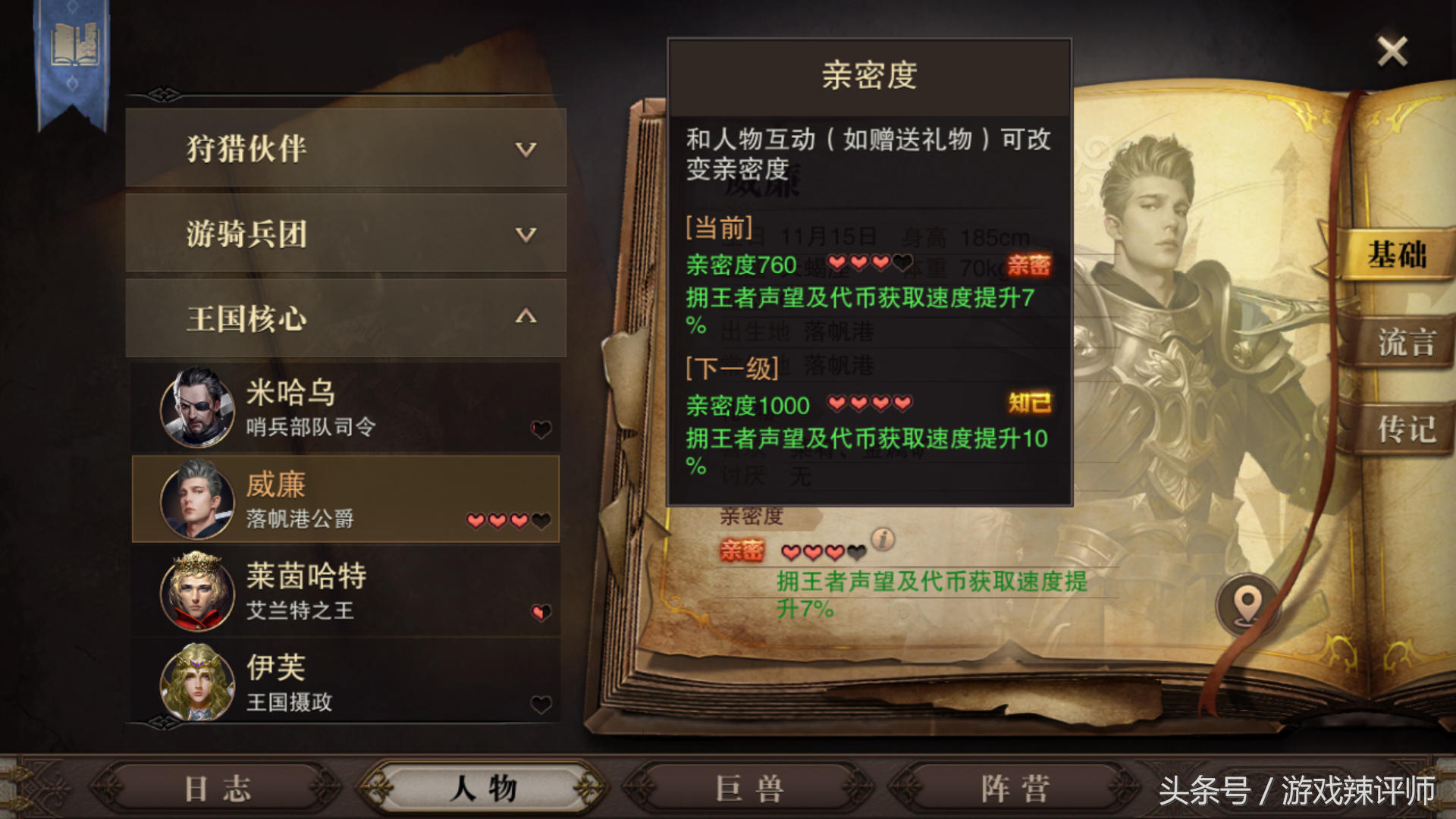 除了伙伴,对玩家收益有影响的NPC也有很多,要根据自己的需要去送礼,每天去酒馆转转,吟游诗人那里会不时更新最新的情报,此外系统也会偶尔提示玩家有新的“流言”,这些可以提高我们送礼的效率。啰嗦一句,像塞莱娜夫人(降低所有阵营声望商店销售价格)、莱因哈特(提升所有势力声望及代币速度)、卡桑德拉(增加每日发放的讨伐证数量)这样实用性较强的NPC可以放在送礼的第二梯队。