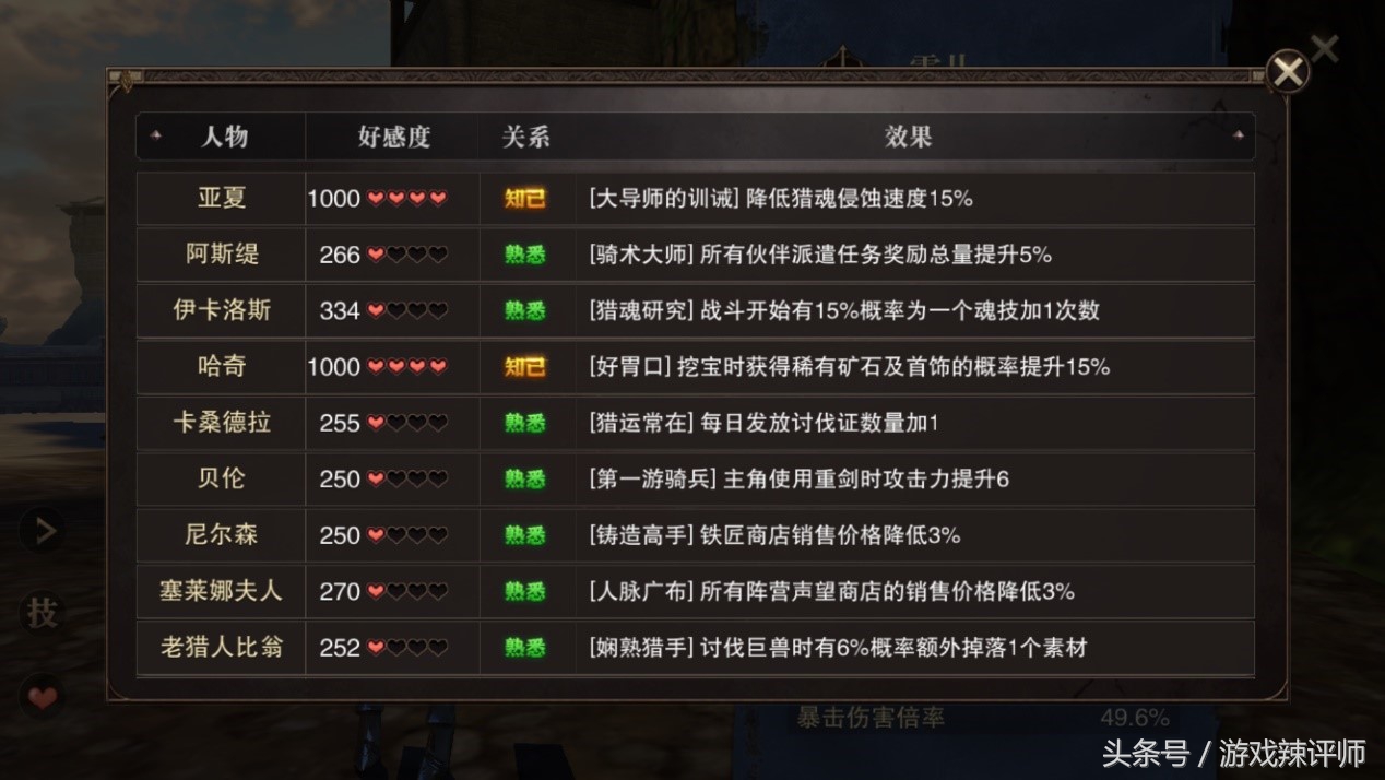 提到伙伴就不得不提到好感度的问题,由于玩家最多可以招募10个伙伴,伙伴的数量也会影响玩家的收益,所以在送礼物的优先度上要有所取舍。这个也没有绝对的标准,比如说笔者玩的是双剑,那么双剑的导师是娜妲、亚夏和威廉,那么他们三人就是优先送礼的对象(这不是废话吗?他们三人可是你的技能导师啊~)。