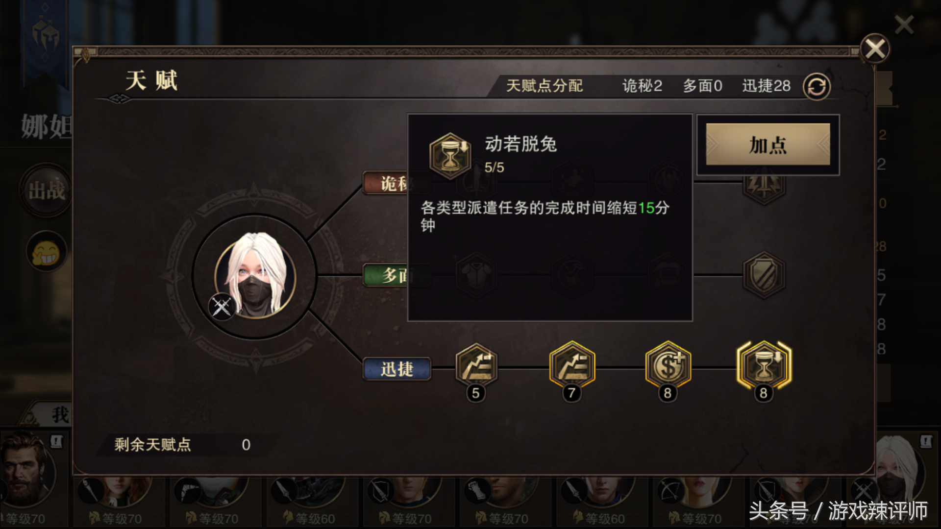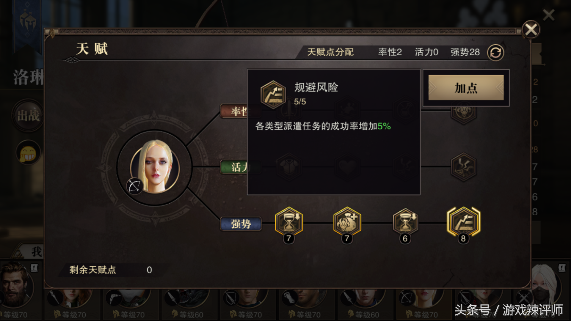 这里再说一下伙伴升阶的事吧,笔者目前把大多数伙伴升到了70级,当然也是花费了大量的资源,但是这也是有优先度的,比如洛琳女神,她有个天赋“规避风险”,可以提高各类型派遣任务的成功率,当然优先升级她了(再说了,洛琳女神的颜值也是值得优先选择她的~23333~),还有我们在新手期遇到的胡林,他有个天赋也是一样的效果,可以优先选择升阶。