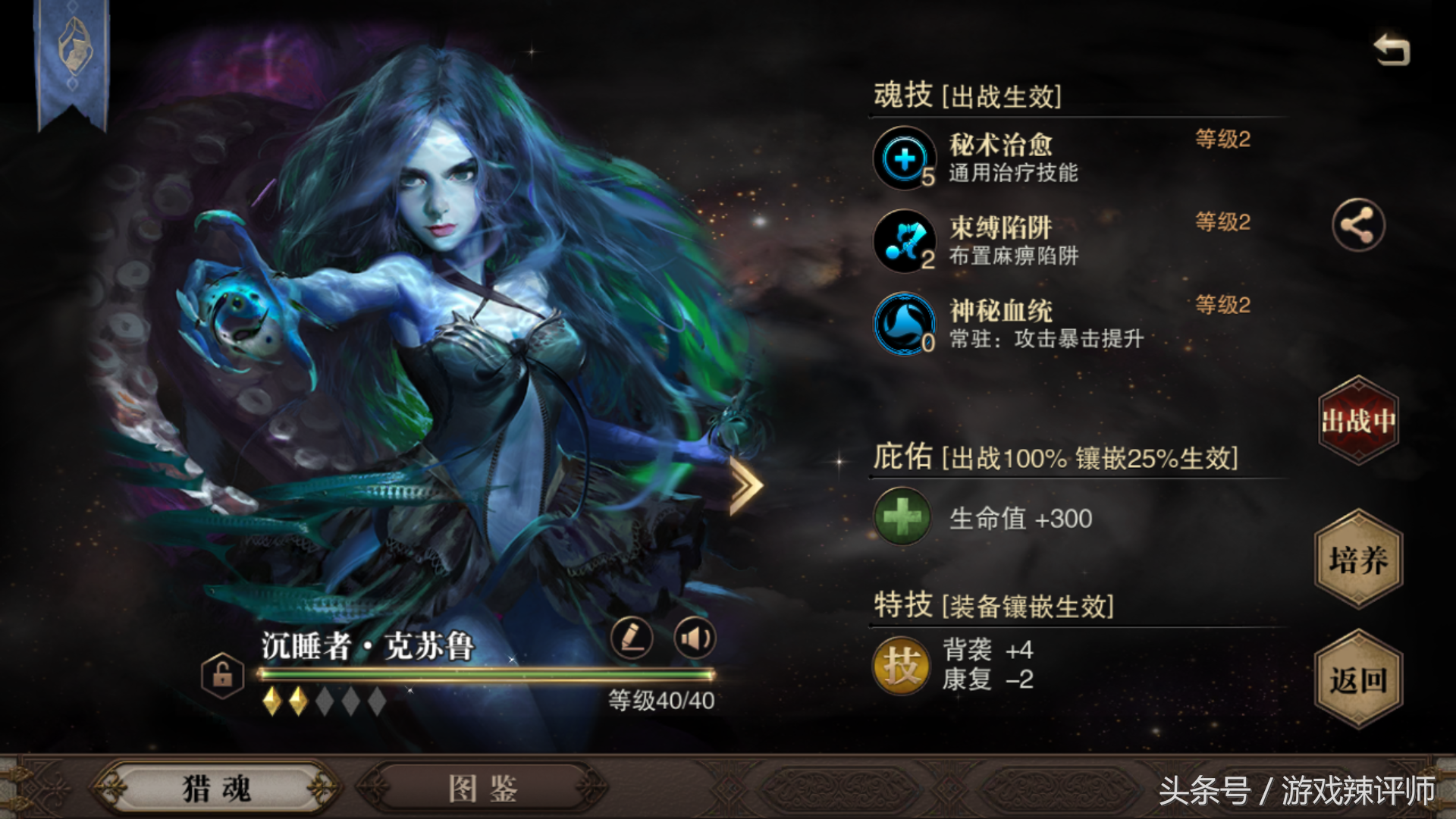 猎魂还是推荐比较主流的那几个,克苏鲁(控制,被动可以增加攻击和暴击,算是使用者最多的了)、哈斯塔(二次魂链、时间停止)和墨盖拉(大奶),这几个是比较适合暴击流双剑的出战猎魂。如果没有上述猎魂,用奈亚、赫萝也行。