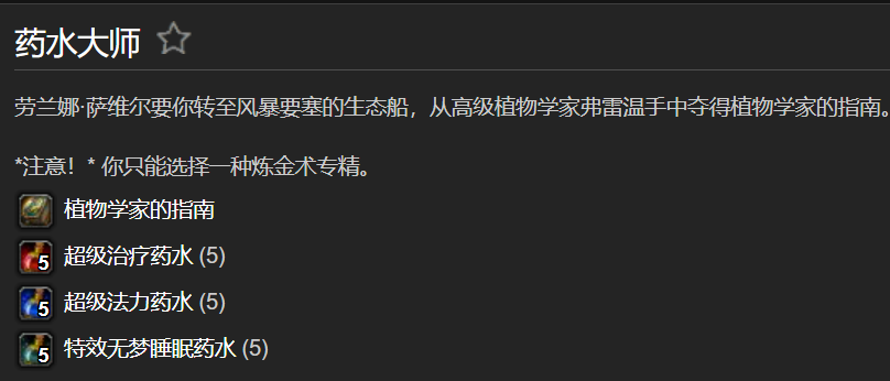 然而这些头铁的玩家似乎忘了燃烧的远征版本中一个新的机制——玩家可以花150金币遗忘专精,再花20金币无需完成专精任务即可习得其他专精。也就是说我们可以直接选择成本更低的药水大师任务,完成后利用药水大师的暴击做药水把炼金技能充满,再花150+20金币换成转化开始每日快乐摸奖。需要注意的是药水大师任务需要前往能源舰,需要70级才能完成。