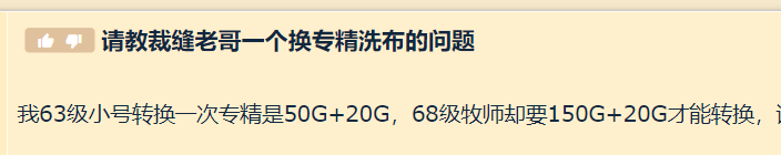 利用换专精一次洗6块高级布这只是基本操作,与炼金专精任务需要68级才能完成不同,60级玩家把裁缝冲到325即可选择裁缝专精,而根据玩家实测60级玩家遗忘专精竟然只要50金币,加上学专精的20金洗一次专精成本只有70金。