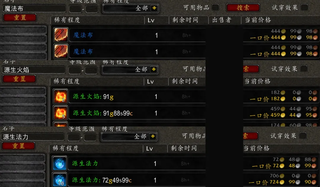 除炼金白嫖转化大师外,裁缝专业的玩家也能利用换专精机制花式洗布。裁缝洗布有4天冷却时间,魔法布、暗影布和原始月布三种布各自独享冷却时间,也就是一个裁缝玩家每4天可以洗出3块高级布,如果做了专精任务则可以洗4块。在TBC初期做一件布甲装备需要二十多块高级布,市场需求远大于产出因此高级布的价格非常昂贵,以奥罗服务器为例一块魔法布的成本只有165金,售价却高达444金,而换专精只要170金币,那么一个暗纹裁缝洗完暗影布后立即花170G改学魔焰裁缝然后洗魔法布就可以多赚444-170=274金币,再改月布裁缝洗原始月布还可以赚更多。