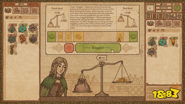 在游戏中有一个重要机制就是“讨价还价”,玩家无论是卖药水给顾客、还是从行商手中购买材料时都可以使用。主要就是当箭头处于进度条中的相应区域时点击鼠标,每次的难度随机,比较考验玩家的反应力。无论讨价还是还价,价格都是有极限的,如果点错或者拖时间的话天平还会往反方向倾斜,因此需要尽快完成讲价,否则会适得其反。如果觉得每次都讲价太累的话可以在卖药水时直接卖,每人多赚1点人气值,买材料时再讲价,能省很大一笔钱,后期药水卖的贵了再针对贵药水讲价。