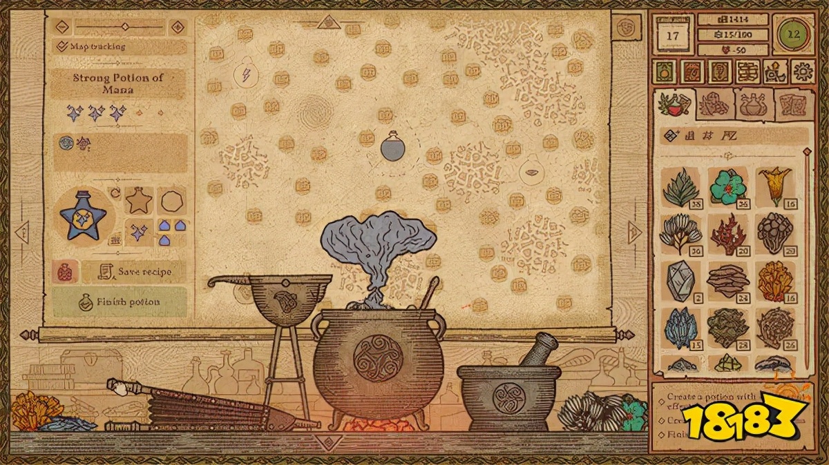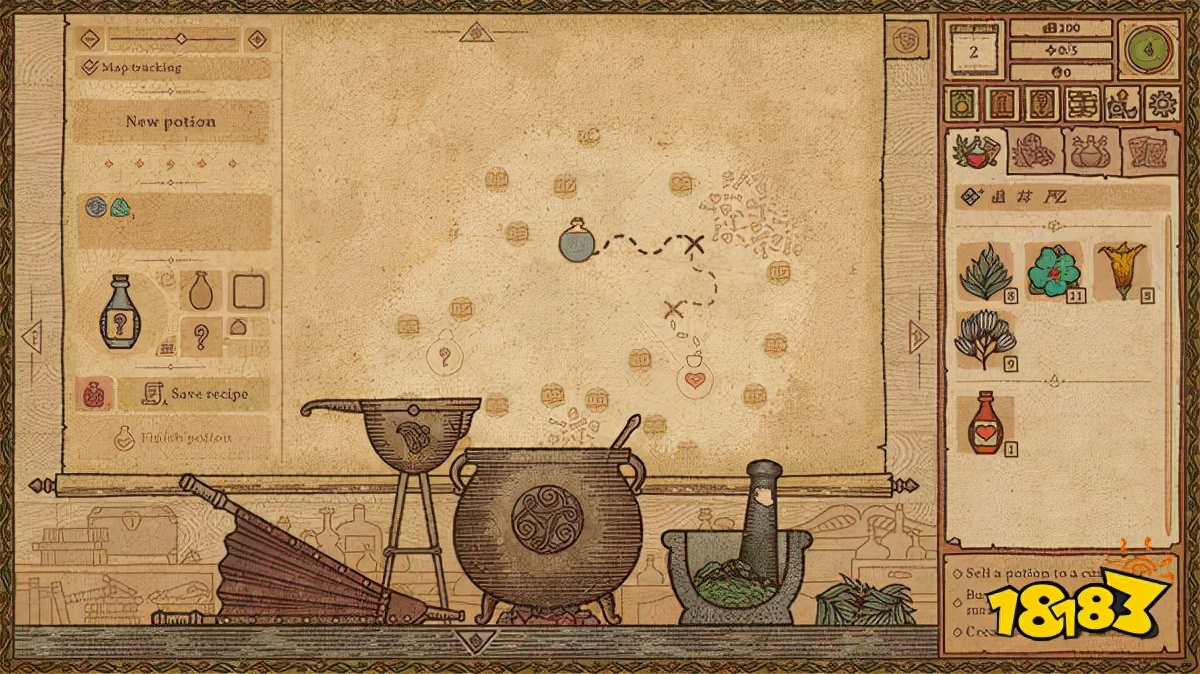 游戏中源于手稿和医学书籍的视觉设计很抓人眼球,在古朴的羊皮纸背景下,五颜六色的各式原料会给人很想动手的感觉,在一群大作的包围下,这种相对清新轻松的画风也使得人可以放松地被带入到那个小村庄里,在悠闲的bgm中慢慢炼药。
