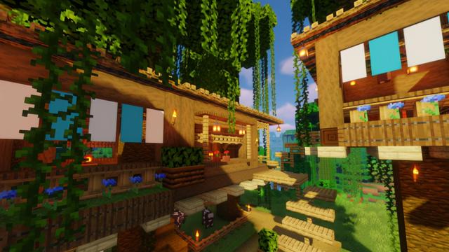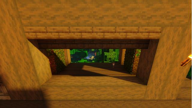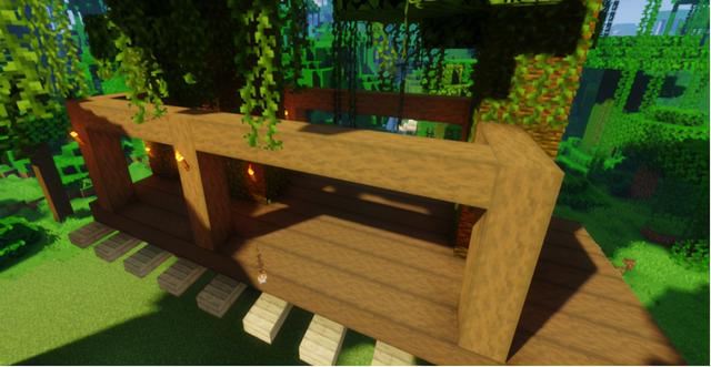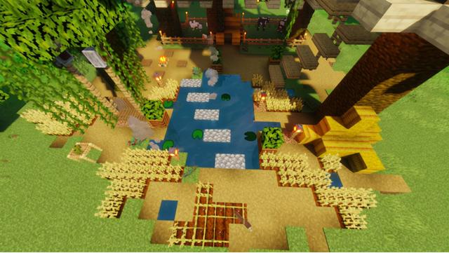 在院子里铺上不规则的草径,然后用小麦、浆果丛、丛林树叶等装饰一下,为房子主体也增加一些光源和植物装饰~