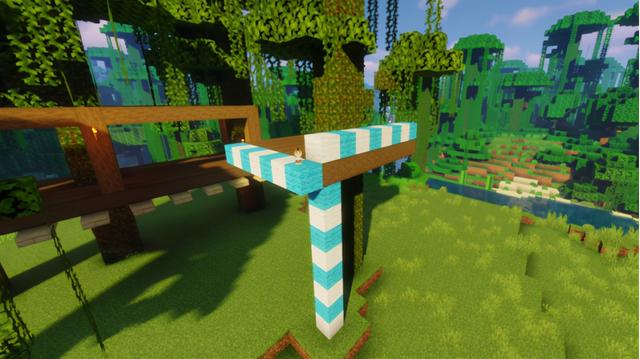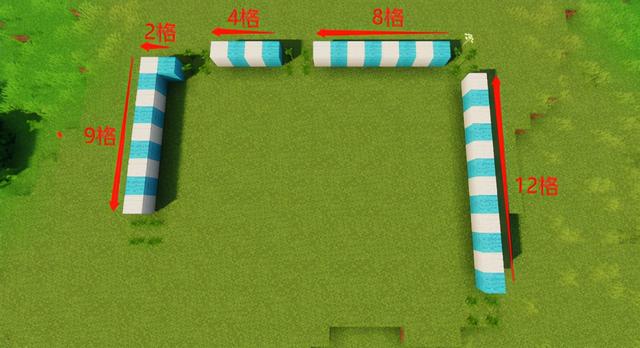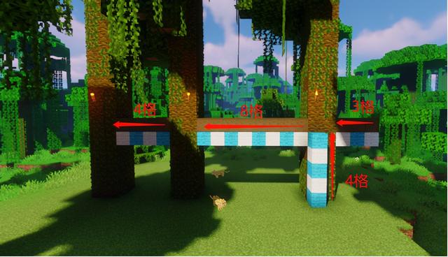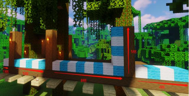 按照下图提示用去皮云杉木建造柱子,然后用去皮云杉木将柱子顶端相连,大