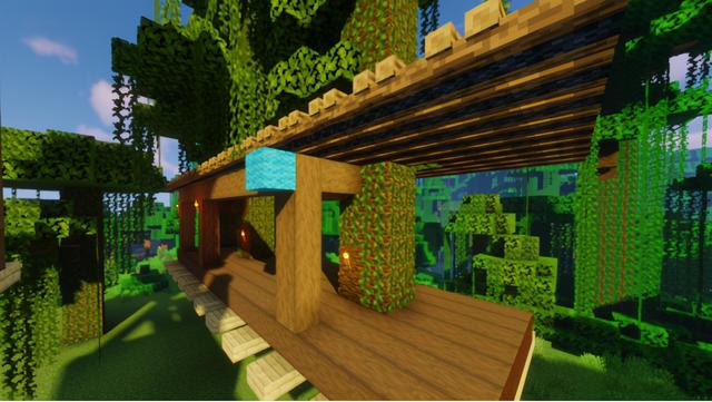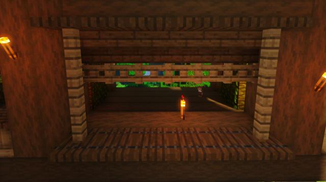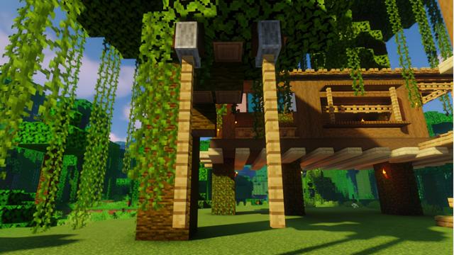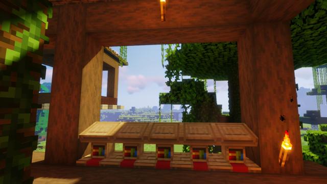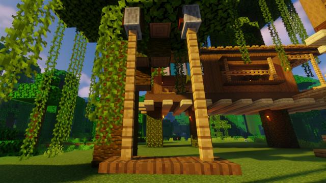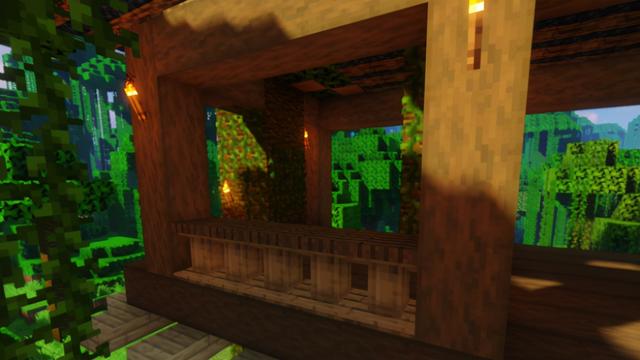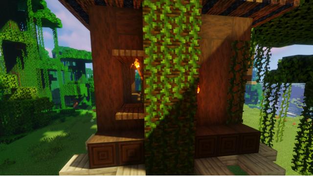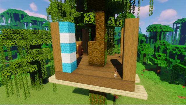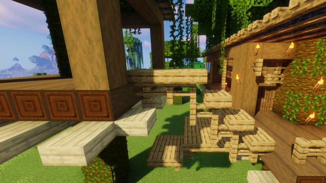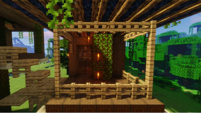 为大树屋右侧的凉台围上橡木栅栏,四角用橡木栅栏与顶棚相接,靠近顶棚的位置摆上一圈橡木栅栏门,大门用的是云杉木门