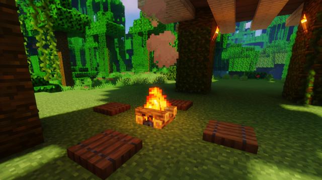 一个可以围坐的篝火也是不错的选择,简单用营火和云杉木活板门按下图摆放,就有不错的效果~