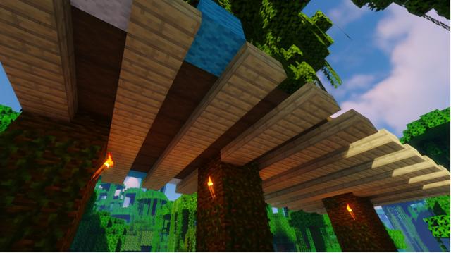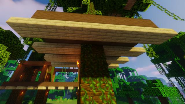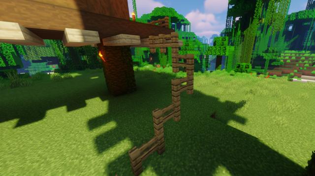 楼梯也是树屋的特色,用橡木栅栏建造一个向上延伸的基础骨架,然后在栅栏上用橡木阶梯铺3格,注意拐角处要扩充成两排的平台哦
