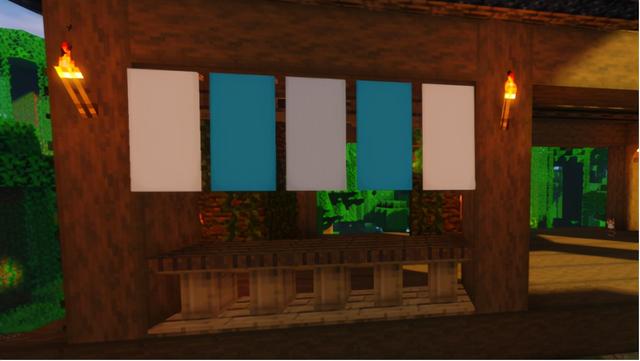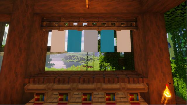 对着窗户位置的上部摆放一排橡木栅栏门,再摁住潜行键往栅栏门上,挂上蓝白相间的旗帜
