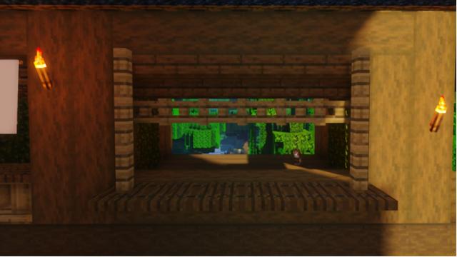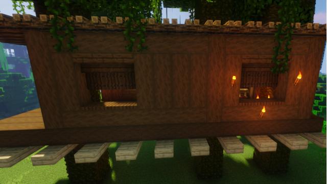 屋后方的窗户则是第三种装饰方式,最简单也是最实用的一种,这个高为3的窗户按第一排倒置云杉木楼梯,第二、三排云杉木活板门填充装饰即可