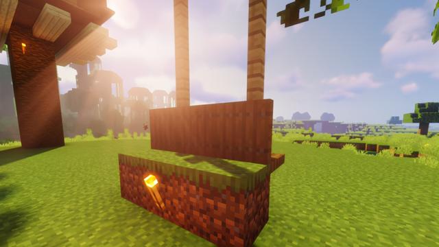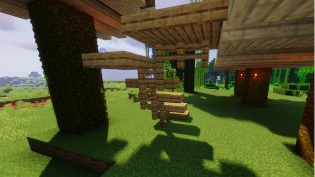 再来一点富有野趣的装饰吧~比如秋千,找一个合适的树枝,在你喜欢的高度放好两个砂轮后,往下搭两根长长的橡木栅栏柱,在柱子离地一格的位置并摆放3个云杉木活板门,别忘了加上一个靠背