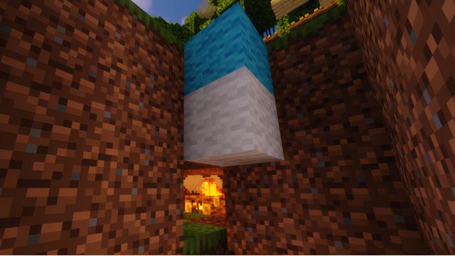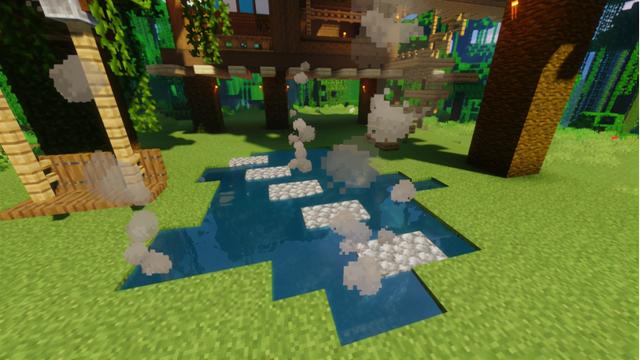 暖暖的温泉也会为人带来幸福感,先在离地面两格的位置提前预埋几个营火,再随意地挖一个小池塘倒好水,在池塘里用圆石铺上石路