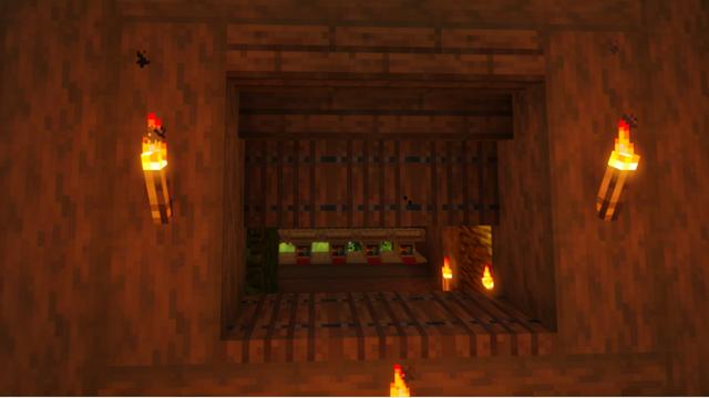 第二种窗户要先用去皮云杉木,在窗户左右两侧搭两根柱子,然后在顶部摆放一排,楼梯面朝外的倒置云杉木楼梯,再在这些楼梯的下面放上一排橡木栅栏门