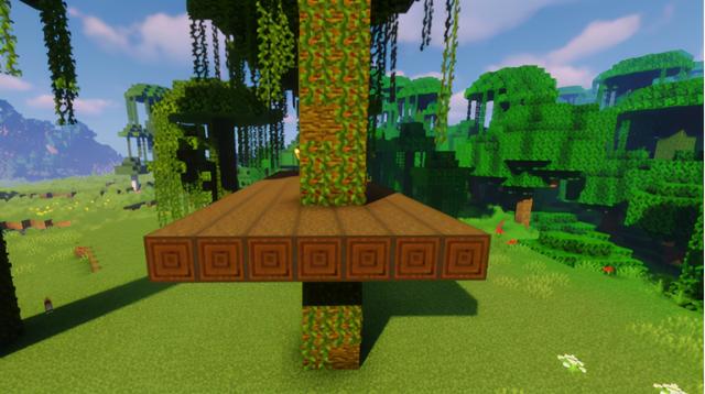 根据下图提示位置,用去皮深色橡木原木铺设树屋地板,地板宽度为7格