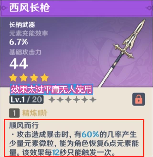 西风长枪是系列武器之一,副属性为元素充能效率,可以帮助角色快速回复元素能量,算是辅助属性的一种,而它被动技能顺风而行,在攻击造成暴击时,有百分之六十的概率生产出少量的元素微粒,差不多能为角色恢复六点元素能量,不过每十二秒只能触发一次,但目前能使用长柄武器的角色很少,个个都还实力超群,并且还有自己的专属武器,所以这把枪基本没有什么用,最多是用香菱打辅助的时候用一下,同样是看以后会不会出个辅助角色来进行使用。