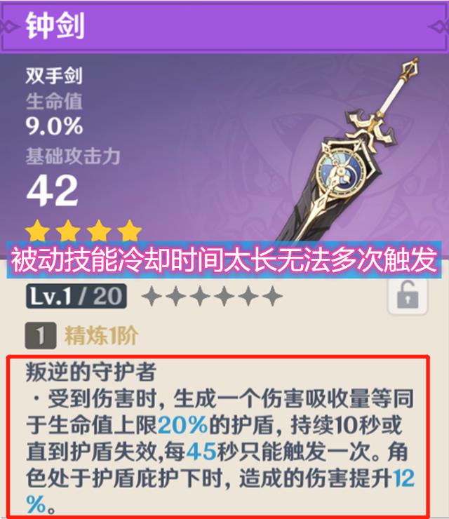 这把武器在内测的时候,还是非常强的,但是经过一次削弱之后,秒变痛苦武器的一种,副属性是生命值百分比,在所有四星武器中,它还是头一个,但目前没有能把生命值转化为攻击力的角色,所以该属性几乎无用,而它的被动技能叛逆的守护者,在受到一定伤害的同时,会将伤害吸收,转化为一个等同为生命值百分之二十的护盾,能够持续十秒,角色若是在这护盾当中,造成的伤害会提高百分之十二,但冷却时间足足有四十五秒,一场战斗能用两次就是极限了,这就显得非常的鸡肋了,建议官方将生命值改为防御力,这样好歹女仆还能用一下。