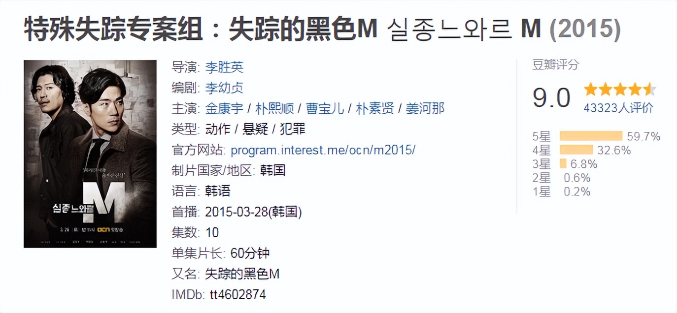 猫猫最近找到一部绝绝子的悬疑剧《特殊失踪专案组M》,是2015年的剧,后来看到豆瓣评分9.0,热爱悬疑剧的我肯定不能放过啦~刚开始看到海报的时候觉得是不认识的演员说实话我还有点不怎么想看,演员表上只看到了一个熟悉的演员名字“曹宝儿”,想着至少有一个认识的演员,我就决定追了。