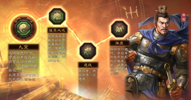 每回合在满庞行动时,有概率使我军单体获得「援护」、「休整」和「驱散」三种效果。但给予的顺序是有优先级:副将(友) > 副将(已) > 主将。意味着,满宠要是副将,战法效果必定会给另一个副将。