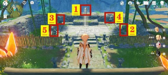 然后来到我们最后一块碎片的地点(岩尊像:3处),总共有五块石像,点击中心残缺文字获得线索:神于正北、骨于东南、身于西北、魂于东北、形于西南。需要按照正北→东南→西北→东北→西南顺序解锁。