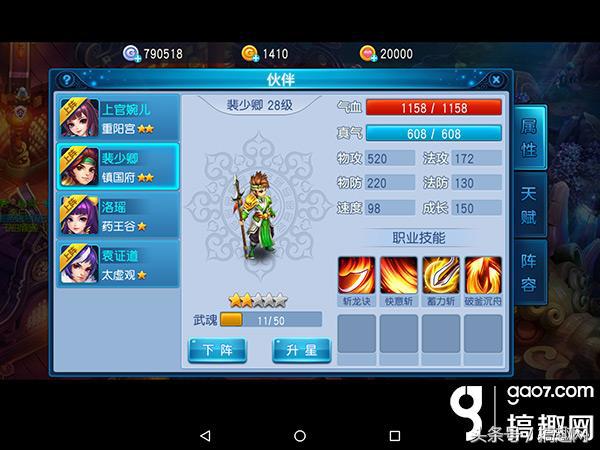 既然以回合制为核心玩法机制,那么玩家的主要任务就是如何培养各角色与伙伴,提升其战力。在游戏中分为主角角色,伙伴与灵兽三大养成系统。主角角色以传统MMORPG游戏的设定,支持装备,技能心法,以及潜能等主要属性提升。而伙伴则采用卡牌手游的设定以升星,天赋,技能提升伙伴实力。灵兽则是通用养成手游中的强化,进阶,洗练。三种角色间不同的养成系统,共同组成玩家强大的阵容战力。