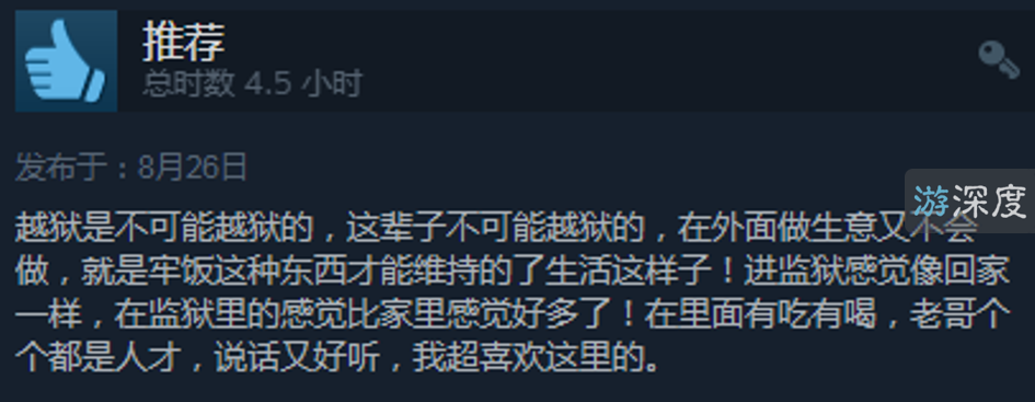 在这些评论中,还夹杂着一些让深度娘十分在意的内容,部分玩家似乎并不想离开这个设施齐全、日常生活劳逸结合的监狱,给出的理由也十分有理有据令人信服,不知道对于这一点各位玩家老爷们是怎么看的呢?