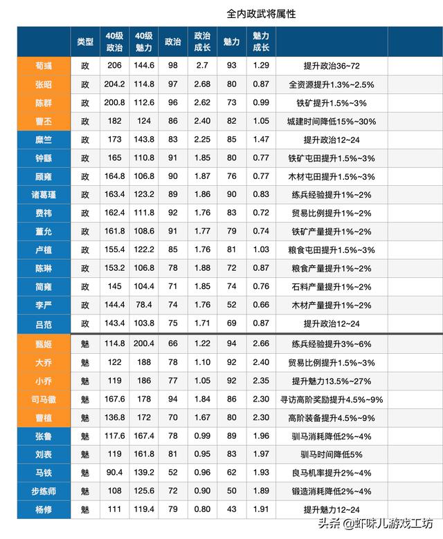 资源官的选择,A级武将政治差异也就是20点以内,也就是0.6%的差异,所以主要还是考虑自带技能,笔者优先选择的是直接资源加成的武将,再加上B级的屯田加成。