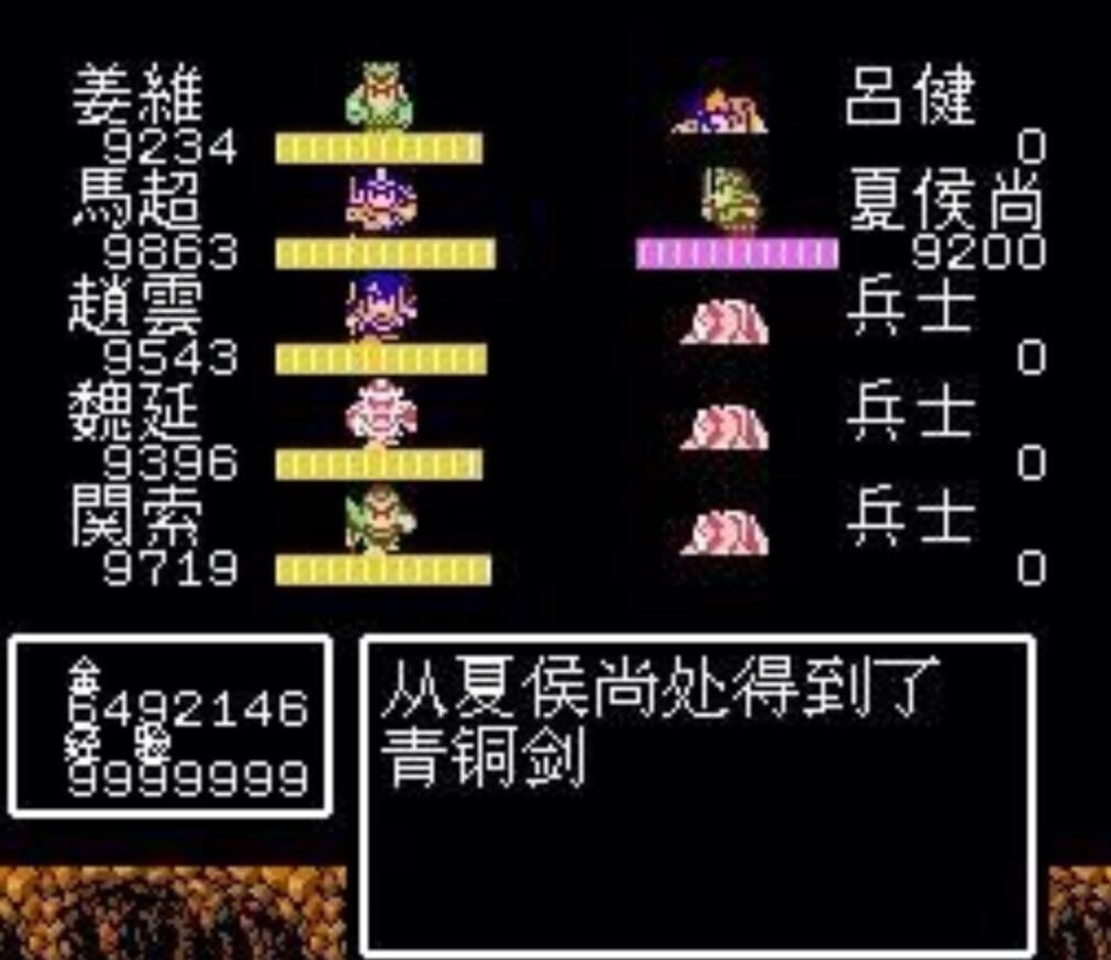 游戏中的隐藏装备可以说是十分多的,无论是在野外探索,还是战斗对砍时,都有一定的概率从敌军武将身上爆出隐藏的装备,很多时候只要成功的将敌军某武将用计谋干掉或叛变,在战斗结束后就也有一定的几率从他身上获得他掉落的隐藏物品。当然了,越强力的高级装备,掉落率就越低,小时候那可真是肝到头晕眼花啊,那时候哪有什么模拟器加速功能跟SAVE/LOAD大法一说啊。。。。。。后来笔者玩模拟器中文版的时候,还专门特意去找了隐藏物品攻略,来了个全收集,算是完成了童年时的一个小小梦想。到现在笔者还记得本作最强隐藏装备青铜剑可以在曹操、曹丕、曹休、夏侯威、司马懿等人身上打出来,其他什么伏龙盾、李广弓、落雷斧之类的,则确实因为年头太久早就记不住了,忘了在谁身上才可以打出来了,汗。