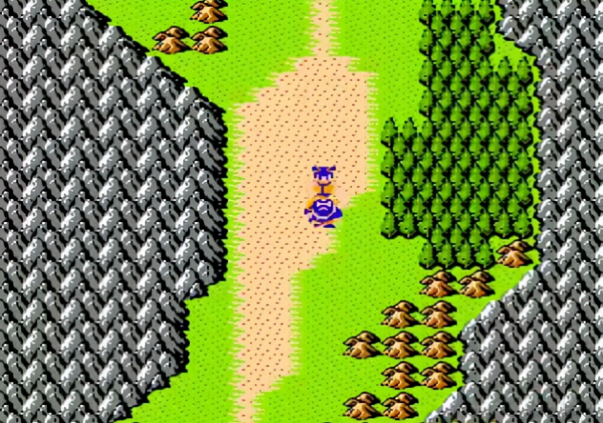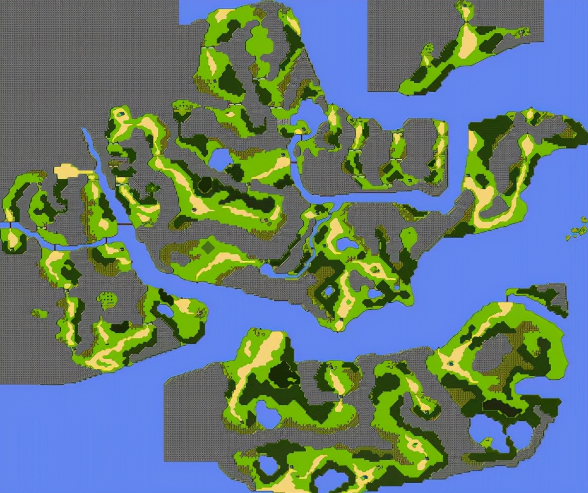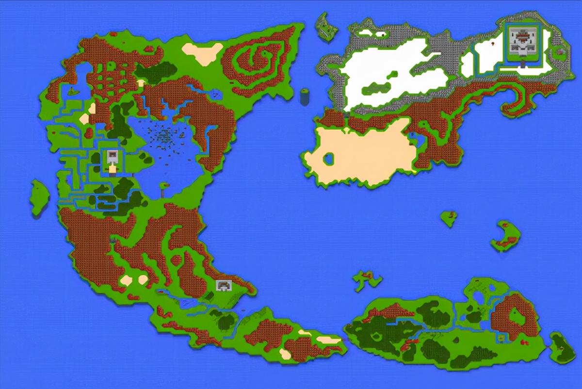 但这个游戏的大地图画得属实不错,个人认为算红白机RPG里数一数二的了,当年有玩家靠一屏一屏截图的方式拼出了世界全图。