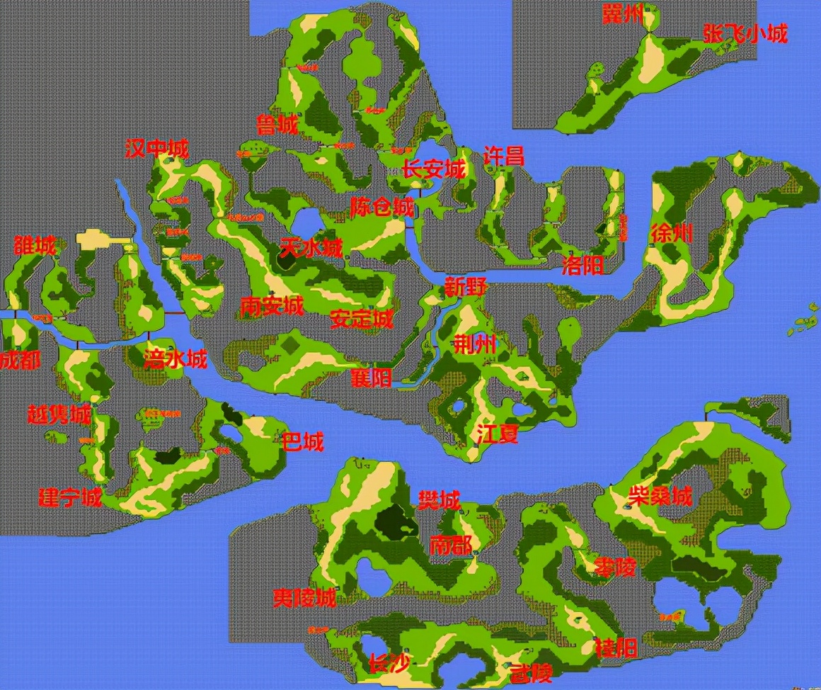 然后我又找到一个标注了城镇的地图版本,感觉看起来更加懵逼了,果然这些荆州、冀州、新野之类的地名对于现代人而言还是不太习惯。不过能够确认的是,《吞食天地2》大地图创作基本属于意识流创作派,没准当年的日本制作者是按照岛国思维画的。