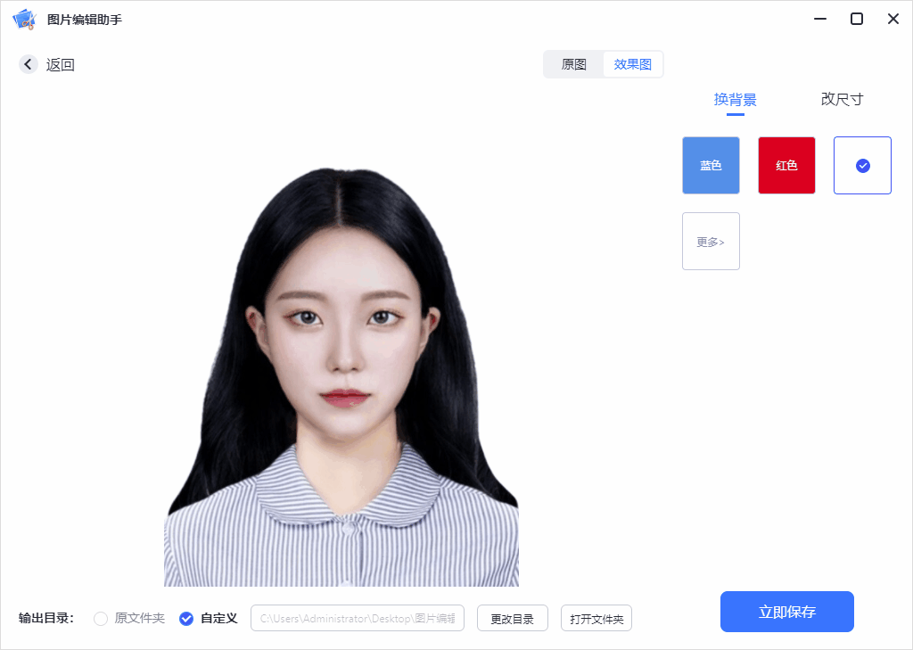 既然抠好的图片可以换背景,那么一定可以更换成纯色的,只需要上传一张正脸图,就能制作电子证件照,蓝底、红底、白底任你选。
