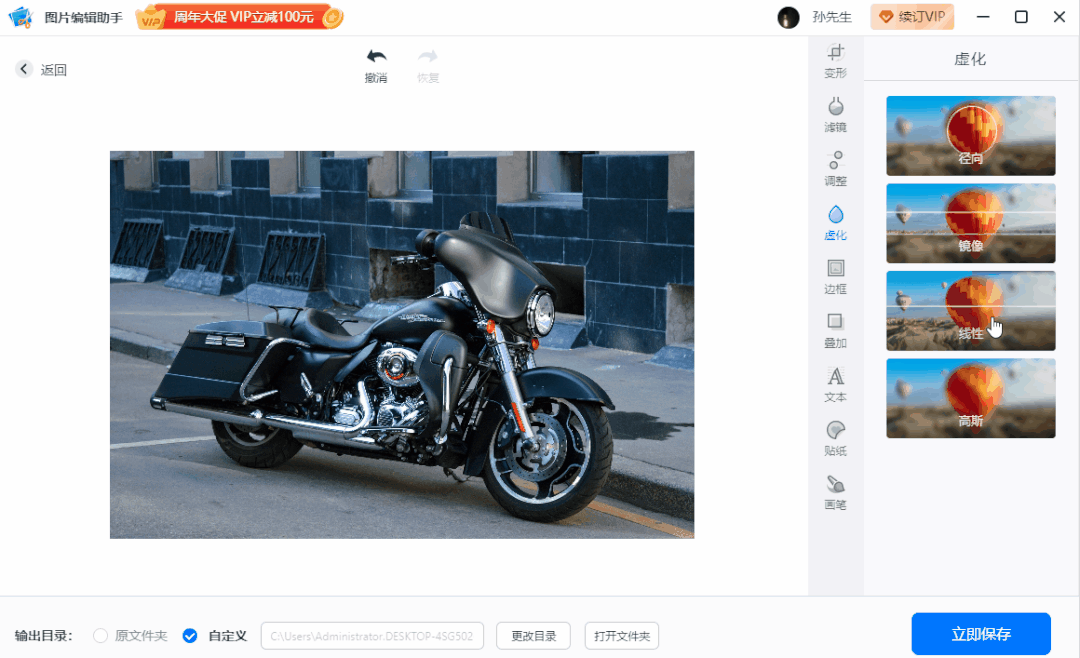 如果你想突出画面重点,点击「虚化」-「线性」,通过调整线段的位置和长短,可以轻松打造远景和近物的视线感。