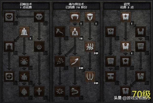 技能20级的顺序为:“复生骷髅”→“骷髅专精”→“尸爆”→“骨牢”→“骨墙”。