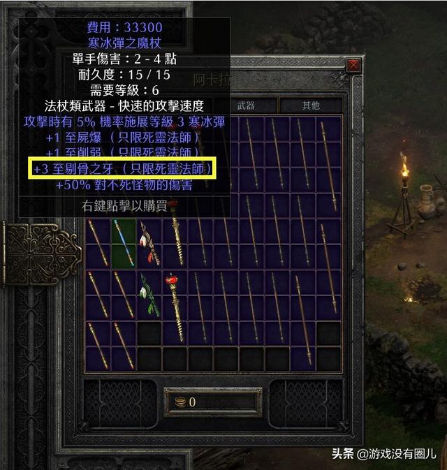 第二章卓格南处购买2孔灰色魔杖,同时拥有“+3尸爆”与“+3骨矛”为最理想,此时可以到噩梦难度下女伯爵处刷14号符文“多尔”与16号符文“破”,打造死灵法师前、中、后期最强符文武器“白色”(是的,如果你坚持这个流派的话,它可以用到地狱毕业)。